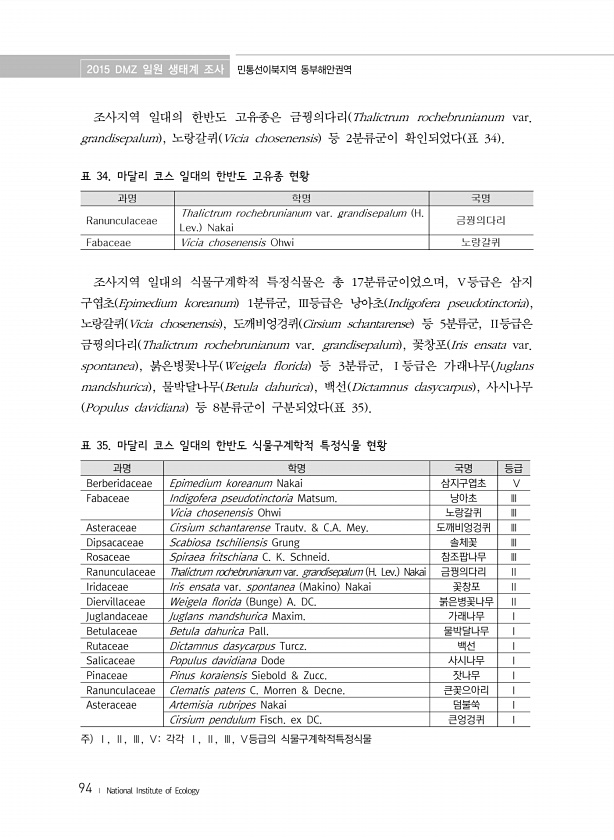 2015 DMZ 일원 생태계 조사 민통선이북지역 동부해안권역 94 ? National Institute of Ecology 조사지역 일대의 한반도 고유종은 금꿩의다리 Thalictrum rochebrunianum var. grandisepalum , 노랑갈퀴 Vicia chosenensis 등 2분류군이 확인되었다 표 34 과명 학명 국명 Ranunculaceae Thalictrum rochebrunianum var. grandisepalum H. Lev. Nakai 금꿩의다리 Fabaceae Vicia chosenensis Ohwi 노랑갈퀴 표 34. 마달리 코스 일대의 한반도 고유종 현황 조사지역 일대의 식물구계학적 특정식물은 총 17분류군이었으며, Ⅴ등급은 삼지 구엽초 Epimedium koreanum...