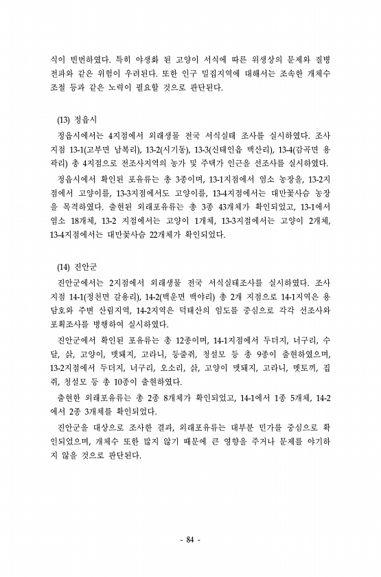 84 식이 빈번하였다. 특히 야생화 된 고양이 서식에 따른 위생상의 문제와 질병 전파와 같은 위험이 우려된다. 또한 인구 밀집지역에 대해서는 조속한 개체수 조절 등과 같은 노력이 필요할 것으로 판단된다. 13 정읍시 정읍시에서는 4지점에서 외래생물 전국 서식실태 조사를 실시하였다. 조사 지점 13-1 고부면 남복리 , 13-2 시기동 , 13-3 신태인읍 백산리 , 13-4 감곡면 용 곽리 총 4지점으로 전조사지역의 농가 및 주택가 인근을 선조사를 실시하였다. 정읍시에서 확인된 포유류는 총 3종이며, 13-1지점에서 염소 농장을, 13-2지 점에서 고양이를, 13-3지점에서도 고양이를, 13-4지점에서는 대만꽃사슴 농장 을 목격하였다. 출현된 외래포유류는 총 3종 43개체가 확인되었고, 13-1에서 염소 1...