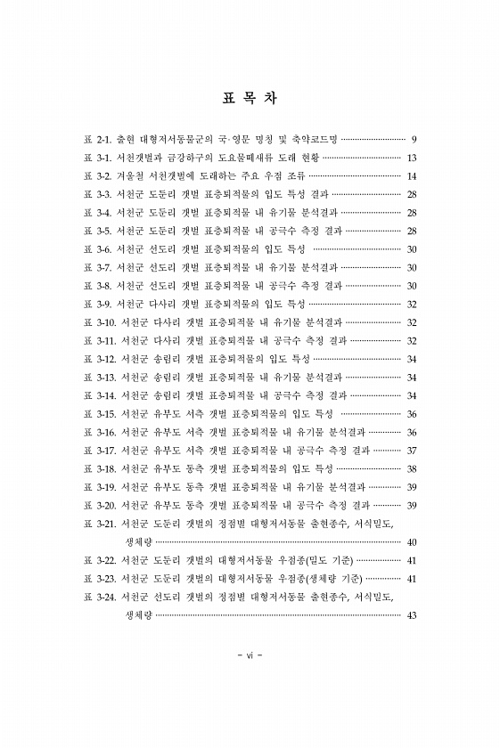 vi 표 목 차 표 2-1. 출현 대형저서동물군의 국 영문 명칭 및 축약코드명 ···························· 9 표 3-1. 서천갯벌과 금강하구의 도요물떼새류 도래 현황 ·································· 13 표 3-2. 겨울철 서천갯벌에 도래하는 주요 우점 조류 ········································ 14 표 3-3. 서천군 도둔리 갯벌 표층퇴적물의 입도 특성 결과 ······························ 28 표 3-4. 서천군 도둔리 갯벌 표층퇴적물 내 유기물 분석결과 ·························· 28 표 3-5. 서천군 도둔리 갯벌 표층퇴적물 내 공극수 측정 결과 ···········...