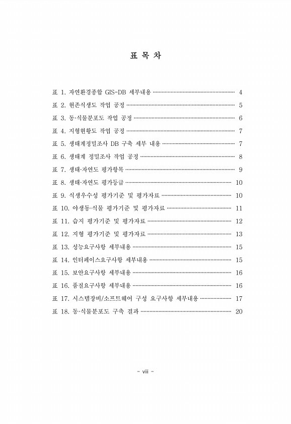 viii 표 목 차 표 1. 자연환경종합 GIS-DB 세부내용 ······················································· 4 표 2. 현존식생도 작업 공정 ········································································· 5 표 3. 동·식물분포도 작업 공정 ···································································· 6 표 4. 지형현황도 작업 공정 ········································································· 7 표 5. 생태계정밀조사 DB 구축 세부 내용 ······...