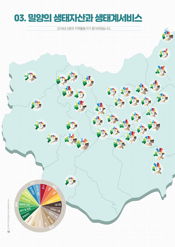 03. 밀양의 생태자산과 생태계서비스 2018년 6명의 지역활동가가 평가하였습니다. 담수 서식처 제공 토양형성 교육 연구 사회적관계 심미적 가치 여가 및 관광 문화유산 소음차단 수분 수질정화 침식 홍수재해 세계적 기후 지역적 기후 대기질 친환경에너지 발전 연료 식량 공급 조절 문화 지지 1 11 21 31 2 12 22 32 42 3 13 23 33 43 4 14 24 44 5 15 35 45 6 36 46 7 17 27 47 8 18 28 9 48 19 49 10 20 16 37 10 우리지역의 생태자산과생태계서비스