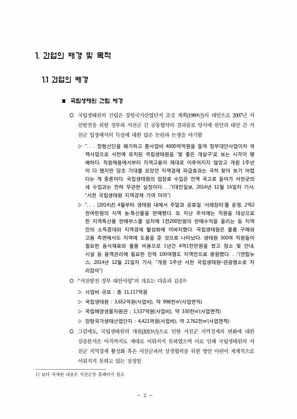2 1. 과업의 배경 및 목적 1.1 과업의 배경 n 국립생태원 건립 배경 ¡ 국립생태원의 건립은 장항국가산업단지 조성 계획 1989년 의 대안으로 2007년 서 천발전을 위한 정부와 서천군 간 공동협약의 결과물로 당시에 원안과 대안 간 서 천군 입장에서의 득실에 대한 많은 논란과 논쟁을 야기함 ▷ “. 장항산단을 폐기하고 총사업비 4000여억원을 들여 정부대안사업이자 국 책사업으로 서천에 유치된 국립생태원을 빛 좋은 개살구로 보는 시각이 팽 배하다. 직원채용에서부터 지역고용이 제대로 이루어지지 않았고 개원 1주년 이 다 됐지만 당초 기대를 모았던 지역경제 파급효과는 극히 찾아 보기 어렵 다는 게 중론이다. 국립생태원의 입장료 수입은 전액 국고로 들어가 서천군의 세 수입과는 전혀 무관한 실정이다. .” 대전...
