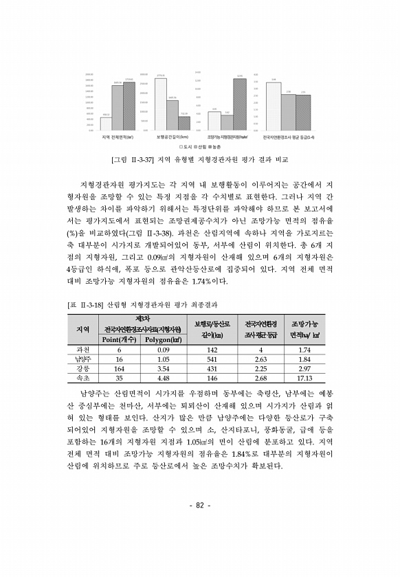 82 [그림 Ⅱ-3-37] 지역 유형별 지형경관자원 평가 결과 비교 지형경관자원 평가지도는 각 지역 내 보행활동이 이루어지는 공간에서 지 형자원을 조망할 수 있는 특정 지점을 각 수치별로 표현한다. 그러나 지역 간 발생하는 차이를 파악하기 위해서는 특정단위를 파악해야 하므로 본 보고서에 서는 평가지도에서 표현되는 조망권제공수치가 아닌 조망가능 면적의 점유율 % 을 비교하였다 그림 Ⅱ-3-38 과천은 산림지역에 속하나 지역을 가로지르는 축 대부분이 시가지로 개발되어있어 동부, 서부에 산림이 위치한다. 총 6개 지 점의 지형자원, 그리고 0.09㎢의 지형자원이 산재해 있으며 6개의 지형자원은 4등급인 하식애, 폭포 등으로 관악산등산로에 집중되어 있다. 지역 전체 면적 대비 조망가능 지형자원의 점유율은 1.74%...