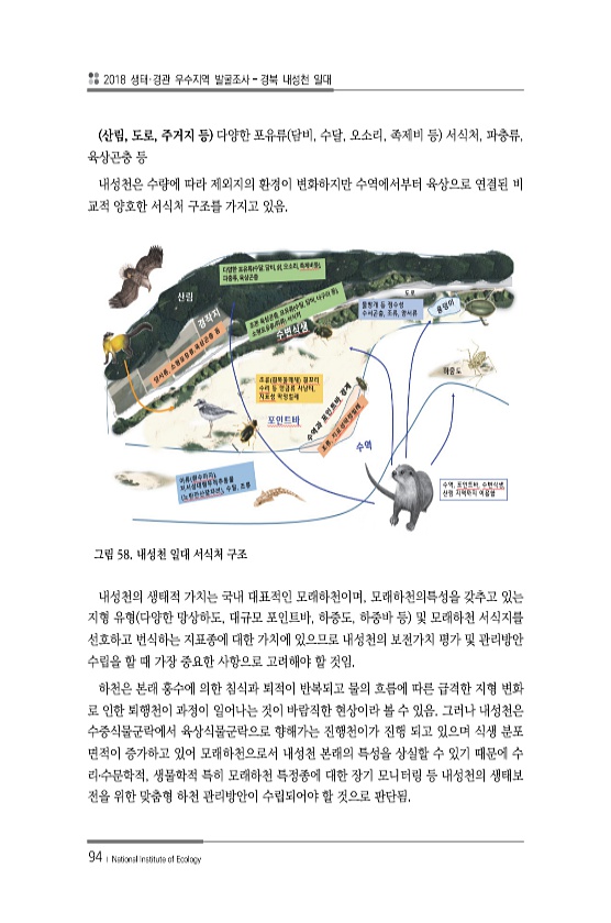 2018 생태·경관 우수지역 발굴조사 경북 내성천 일대 94 ? National Institute of Ecology 산림, 도로, 주거지 등 다양한 포유류 담비, 수달, 오소리, 족제비 등 서식처, 파충류, 육상곤충 등 내성천은 수량에 따라 제외지의 환경이 변화하지만 수역에서부터 육상으로 연결된 비 교적 양호한 서식처 구조를 가지고 있음. 그림 58. 내성천 일대 서식처 구조 내성천의 생태적 가치는 국내 대표적인 모래하천이며, 모래하천의특성을 갖추고 있는 지형 유형 다양한 망상하도, 대규모 포인트바, 하중도, 하중바 등 및 모래하천 서식지를 선호하고 번식하는 지표종에 대한 가치에 있으므로 내성천의 보전가치 평가 및 관리방안 수립을 할 때 가장 중요한 사항으로 고려해야 할 것임. 하천은 본래 훙수에 의한 침...