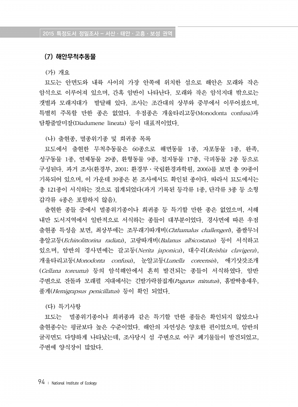 2015 특정도서 정밀조사 서산·태안·고흥·보성 권역 94 ? National Institute of Ecology 7 해안무척추동물 가 개요 묘도는 안면도와 내륙 사이의 가장 안쪽에 위치한 섬으로 해안은 모래와 작은 암석으로 이루어져 있으며, 간혹 암반이 나타난다. 모래와 작은 암석지대 밖으로는 갯벌과 모래지대가 발달해 있다. 조사는 조간대의 상부와 중부에서 이루어졌으며, 특별히 주목할 만한 종은 없었다. 우점종은 개울타리고둥 Monodonta confusa 과 담황줄말미잘 Diadumene lineata 등이 대표적이었다. 나 출현종, 멸종위기종 및 희귀종 목록 묘도에서 출현한 무척추동물은 60종으로 해면동물 1종, 자포동물 1종, 완족, 성구동물 1종, 연체동물 29종, 환형동물 9종, 절지동물 17종...
