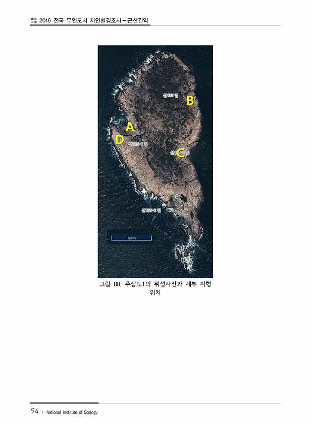 2016 전국 무인도서 자연환경조사 군산권역 94 ? National Institute of Ecology 그림 88. 주삼도1의 위성사진과 세부 지형위치
