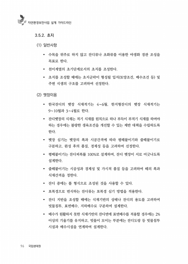 96 국립생태원 자연환경보전사업 설계 가이드라인 3.5.2. 초지 1 일반사항 수목을 위주로 하지 않고 잔디류나 초화류를 이용한 야생화 경관 조성을 목표로 한다. 천이계열의 초기단계로서의 초지를 조성한다. 초지를 조성할 때에는 초지군락이 형성될 입지 토양조건, 배수조건 등 및 주변 식생의 구조를 고려하여 선정한다. 2 뗏장이용 한국잔디의 뗏장 식재적기는 4∼6월, 한지형잔디의 뗏장 식재적기는 9∼10월과 3∼4월로 한다. 잔디뗏장의 식재는 적기 식재를 원칙으로 하나 부득이 부적기 식재를 하여야 하는 경우에는 불량한 생육조건을 개선할 수 있는 제반 대책을 수립하도록 한다. 뗏장 심기는 뗏장의 폭과 시공간격에 따라 평떼붙이기와 줄떼붙이기로 구분하고, 완성 후의 품질, 경제성 등을 고려하여 선정한다. 평떼붙이기는...