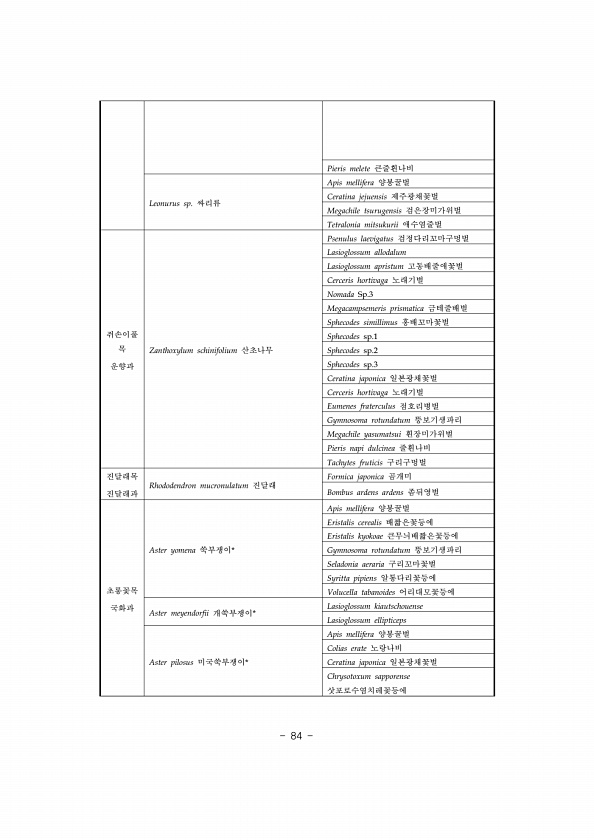 84 Pieris melete 큰줄흰나비 Leonurus sp. 싸리류 Apis mellifera 양봉꿀벌 Ceratina jejuensis 제주광채꽃벌 Megachile tsurugensis 검은장미가위벌 Tetralonia mitsukurii 애수염줄벌 쥐손이풀 목 운향과 Zanthoxylum schinifolium 산초나무 Psenulus laevigatus 검정다리꼬마구멍벌 Lasioglossum allodalum Lasioglossum apristum 고동배줄애꽃벌 Cerceris hortivaga 노래기벌 Nomada Sp.3 Megacampsemeris prismatica 금테줄배벌 Sphecodes simillimus 홍배꼬마꽃벌 Sphecodes sp.1 Sphecodes sp.2 Sphec...