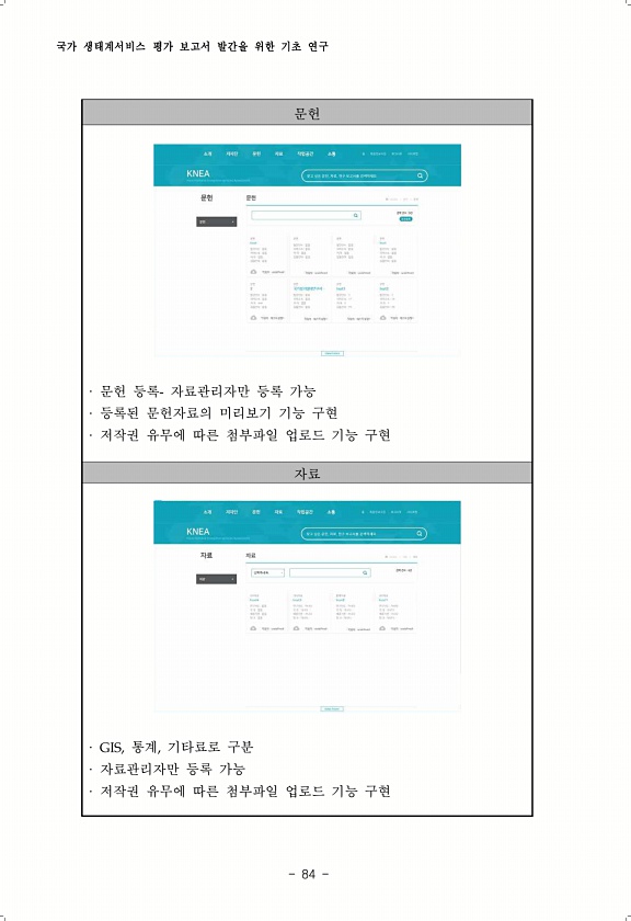 국가 생태계서비스 평가 보고서 발간을 위한 기초 연구 84 문헌 · 문헌 등록- 자료관리자만 등록 가능 · 등록된 문헌자료의 미리보기 기능 구현 · 저작권 유무에 따른 첨부파일 업로드 기능 구현 자료 · GIS, 통계, 기타료로 구분 · 자료관리자만 등록 가능 · 저작권 유무에 따른 첨부파일 업로드 기능구현