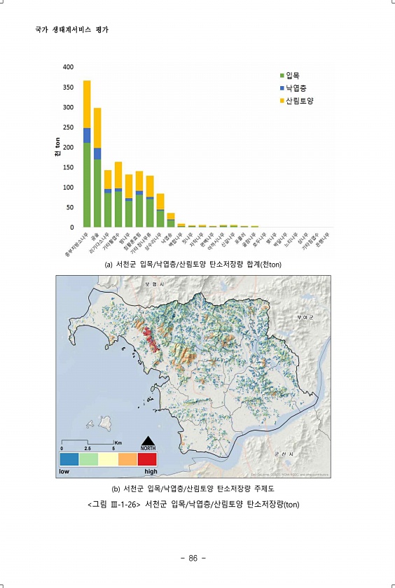 국가 생태계서비스 평가 86 a 서천군 입목/낙엽층/산림토양 탄소저장량 합계 천ton b 서천군 입목/낙엽층/산림토양 탄소저장량 주제도 그림 Ⅲ-1-26 서천군 입목/낙엽층/산림토양 탄소저장량 ton