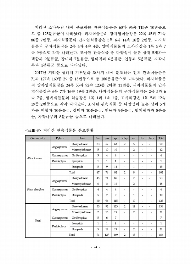 74 지리산 소나무림 내에 분포하는 관속식물문은 60과 96속 115종 10변종으 로 총 125분류군이 나타났다. 피자식물문의 쌍자엽식물강은 22목 45과 71속 86종 7변종, 피자식물문의 단자엽식물강은 5목 6과 14속 16종 2변종, 나자식 물문의 구과식물강은 2목 4과 4속 4종, 양치식물문의 고사리강은 1목 5과 7 속 9종으로 각각 나타났다. 조사된 관속식물 중 다양성이 높은 상위 5개과는 백합과 9분류군, 장미과 7분류군, 범의귀과 6분류군, 인동과 5분류군, 자작나 무과 4분류군 등으로 나타났다. 2017년 지리산 생태계 기후변화 조사지 내에 분포하는 전체 관속식물문은 71과 127속 169종 2아종 15변종으로 총 186분류군으로 나타났다. 피자식물문 의 쌍자엽식물강은 24목 53과 92속 ...