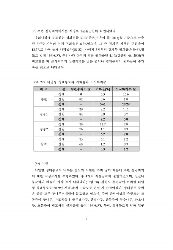 89 고, 주변 산림지역에서는 개망초 1분류군만이 확인되었다. 우리나라에 분포하는 귀화식물 321분류군 이유미 등, 2011 을 기준으로 산출 된 강릉2 지역의 전체 귀화율은 6.7%였으며, 그 중 경계부 지역의 귀화율이 12.7%로 가장 높게 나타났다 표 22 나머지 3지역의 경계부 귀화율은 56%정 도로 낮게 나타났다. 우리나라 산지의 평균 귀화율인 4.4% 김준민 등, 2000 와 비교했을 때 조사지역의 산림지역은 낮은 편이나 경계부에서 귀화율이 증가 하는 것으로 나타났다. 지 역 구 분 수관층피도 % 귀화율 % 도시화지수 % 홍천 경계 0 5.3 15.6 산림 82 0.6 1.8 전체 5.61 10.29 강릉1 경계 20 2.2 10.1 산림 84 0.9 3.7 전체 2.2 5.8 강릉2 경계 18 ...