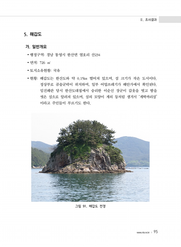 Ⅱ. 조사결과 www.nie.re.kr ? 95 5. 해갑도 가. 일반개요 ? 행정구역경남 통영시 한산면 염호리 산234 ? 면적726 ㎡ ? 토지소유현황국유 ? 현황해갑도는 한산도와 약 0.15㎞ 떨어져 있으며, 섬 크기가 작은 도서이다. 정상부로 곰솔군락이 위치하며, 일부 어업쓰레기가 해안가에서 확인된다. 임진왜란 당시 한산도대첩에서 승리한 이순신 장군이 갑옷을 벗고 땀을 씻은 섬으로 알려져 있으며, 섬의 모양이 게의 등처럼 생겨서 ‘게딱까리섬’ 이라고 주민들이 부르기도 한다. 그림 91. 해갑도전경
