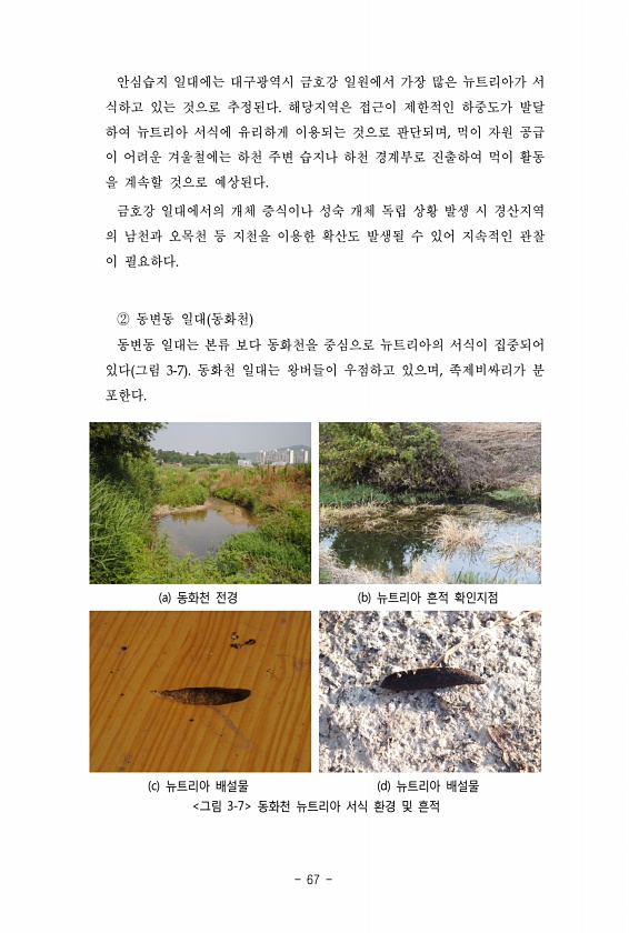 안심습지 일대에는 대구광역시 금호강 일원에서 가장 많은 뉴트리아가 서 식하고 있는 것으로 추정된다. 해당지역은 접근이 제한적인 하중도가 발달 하여 뉴트리아 서식에 유리하게 이용되는 것으로 판단되며, 먹이 자원 공급 이 어려운 겨울철에는 하천 주변 습지나 하천 경계부로 진출하여 먹이 활동 을 계속할 것으로 예상된다. 금호강 일대에서의 개체 증식이나 성숙 개체 독립 상황 발생 시 경산지역 의 남천과 오목천 등 지천을 이용한 확산도 발생될 수 있어 지속적인 관찰 이 필요하다. ② 동변동 일대 동화천 동변동 일대는 본류 보다 동화천을 중심으로 뉴트리아의 서식이 집중되어 있다 그림 3-7 동화천 일대는 왕버들이 우점하고 있으며, 족제비싸리가 분 포한다. ? ? ? ? ? ? ? ? ? ? ??