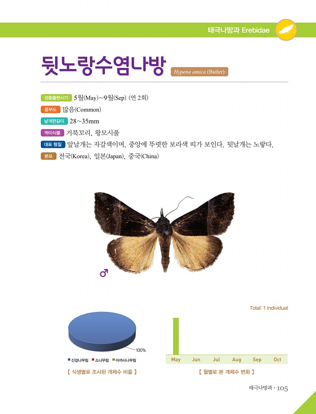 태극나방과?105 태극나방과 Erebidae 성충출현시기 5월 May 9월 Sep 연 2회 풍부도 많음 Common 날개편길이 2835mm 먹이식물 거북꼬리, 왕모시풀 대표 형질 앞날개는 자갈색이며, 중앙에 뚜렷한 보라색 띠가 보인다. 뒷날개는 노랗다. 분포 전국 Korea , 일본 Japan , 중국 China 뒷노랑수염나방 Hypena amica Butler 【 월별로 본 개체수 변화 】 Total1 individual 【 식생별로 조사된 개체수 비율 】 100% 신갈나무림 소나무림 아까시나무림 May Jun Jul Aug SepOct