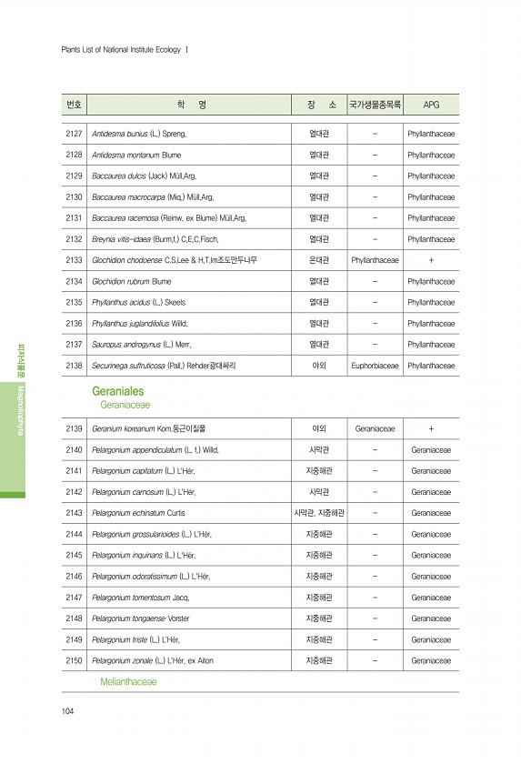 104 번호 학 명 장 소 국가생물종목록 APG 피자식물문 Magnoliophyta Plants List of National Institute Ecology Ⅰ 2127 Antidesma bunius L. Spreng. 열대관 Phyllanthaceae 2128 Antidesma montanum Blume 열대관 Phyllanthaceae 2129 Baccaurea dulcis Jack M?ll.Arg. 열대관 Phyllanthaceae 2130 Baccaurea macrocarpa Miq. M?ll.Arg. 열대관 Phyllanthaceae 2131 Baccaurea racemosa Reinw. ex Blume M?ll.Arg. 열대관 Phyllanthaceae 2132 Breynia vitis-idae...