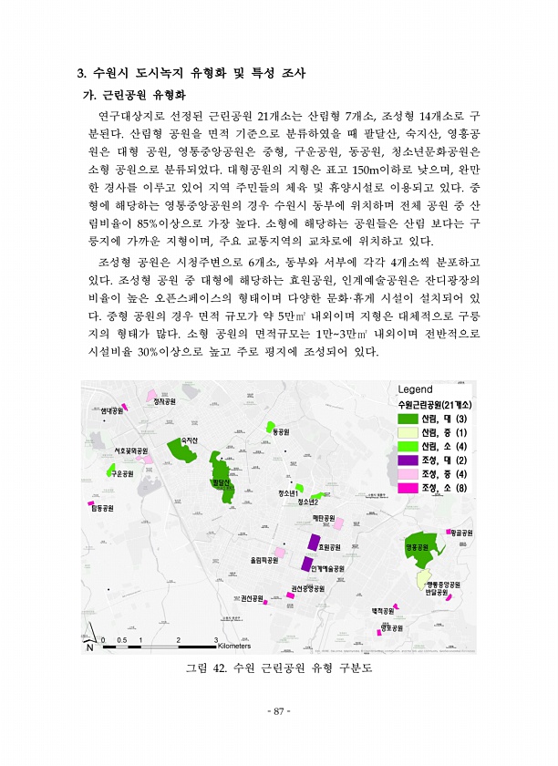 87 수원시 도시녹지 유형화 및 특성 조사 가 근린공원 유형화 연구대상지로 선정된 근린공원 개소는 산림형 개소 조성형 개소로 구 분된다 산림형 공원을 면적 기준으로 분류하였을 때 팔달산 숙지산 영흥공 원은 대형 공원 영통중앙공원은 중형 구운공원 동공원 청소년문화공원은 소형 공원으로 분류되었다 대형공원의 지형은 표고 이하로 낮으며 완만 한 경사를 이루고 있어 지역 주민들의 체육 및 휴양시설로 이용되고 있다 중 형에 해당하는 영통중앙공원의 경우 수원시 동부에 위치하며 전체 공원 중 산 림비율이 이상으로 가장 높다 소형에 해당하는 공원들은 산림 보다는 구 릉지에 가까운 지형이며 주요 교통지역의 교차로에 위치하고 있다 조성형 공원은 시청주변으로 개소 동부와 서부에 각각 개소씩 분포하고 있다 조성형 공원 중 대형에 ...