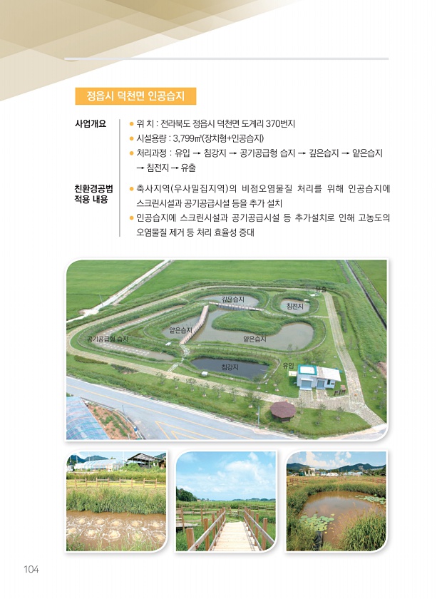104 사업개요 정읍시 덕천면 인공습지 ● 위 치 전라북도 정읍시 덕천면 도계리 370번지 ● 시설용량 3,799㎥ 장치형+인공습지 ● 처리과정 유입 → 침강지 → 공기공급형 습지 → 깊은습지 → 얕은습지 → 침전지 → 유출 ● 축사지역 우사밀집지역 의 비점오염물질 처리를 위해 인공습지에 스크린시설과 공기공급시설 등을 추가 설치 ● 인공습지에 스크린시설과 공기공급시설 등 추가설치로 인해 고농도의 오염물질 제거 등 처리 효율성 증대 친환경공법 적용 내용 공기공급형 습지 얕은습지 얕은습지 침강지 깊은습지 침전지 유출유입