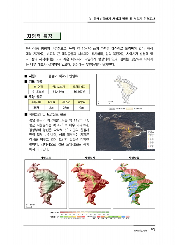 Ⅳ. 뿔제비갈매기 서식지 발굴 및 서식지 환경조사 www.nie.re.kr ? 93 지형적 특징 북서-남동 방향의 바위섬으로, 높이 약 5070 m의 가파른 해식애로 둘러싸여 있다. 해식 애의 기저에는 비교적 큰 해식동굴과 시스택이 위치하며, 섬의 북단에는 시아치가 발달해 있 다. 섬의 해식애에는 크고 작은 타포니가 다양하게 형성되어 있다. 섬에는 정상부로 이어지 는 나무 데크가 설치되어 있으며, 정상에는 무인등대가 위치한다. ■ 지질중생대 백악기 반암류 ■ 지표 피복 총 면적 암반노출지 토양피복지 91,636㎡ 55,469㎡ 36,167㎡ ■ 토양 심도 측정지점 최솟값 최댓값 중앙값 35개 2㎝ 27㎝ 9㎝ ■ 지형환경 및 토양심도 분포 경남 홍도의 최고해발고도는 약 112m이며, 평균 지형경사는 약 47...