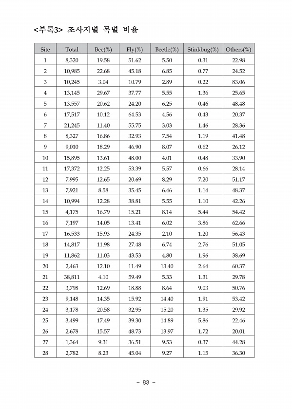 3 Site Total Bee % Fly % Beetle % Stinkbug % Others % 1 8,320 19.58 51.62 5.50 0.31 22.98 2 10,985 22.68 45.18 6.85 0.77 24.52 3 10,245 3.04 10.79 2.89 0.22 83.06 4 13,145 29.67 37.77 5.55 1.36 25.65 5 13,557 20.62 24.20 6.25 0.46 48.48 6 17,517 10.12 64.53 4.56 0.43 20.37 7 21,245 11.40 55.75 3.03 1.46 28.36 8 8,327 16.86 32.93 7.54 1.19 41.48 9 9,010 18.29 46.90 8.07 0.62 26.12 10 15,895 13.61 4...