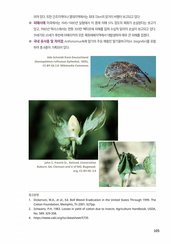 105 려져 있다. 또한 건조지역이나 열대지역에서는 최대 72km의 장거리 비행이 보고되고 있다. ● 피해사례 미국에서는 1945-1980년 실험에서 이 종에 의해 51% 정도의 목화가 손실된다는 보고가 있고, 1980년 텍사스에서는 면화 300만 헥타르에 피해를 입혀 수십억 달러의 손실이 보고되고 있다. 19세기와 20세기 후반에 아메리카의 모든 목화재배지역에서 대발생하여 매우 큰 피해를 입혔다. ● 국내 유사종 및 차이점 Anthonomus속에 딸기의 주요 해충인 딸기꽃바구미 A. bisignifer 를 포함 하여 총 8종이 기록되어 있다. 참고문헌 1. Dickerson, W.A., et al., Ed. Boll Weevil Eradication in the United States Through 19...