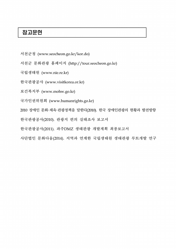 참고문헌 서천군청 www.seocheon.go.kr/kor.do 서천군 문화관광 홈페이지 http//tour.seocheon.go.kr 국립생태원 www.nie.re.kr 한국관광공사 www.visitkorea.or.kr 보건복지부 www.mohw.go.kr 국가인권위원회 www.humanrights.go.kr 2010 장애인 문화·체육·관광정책을 말한다 2010 한국 장애인관광의 현황과 발전방향 한국관광공사 2010 관광지 편의 실태조사 보고서 한국관광공사 2011 파주DMZ 생태관광 개발계획 최종보고서 사단법인 문화다움 2014 지역과 연계한 국립생태원 생태관광 루트개발연구
