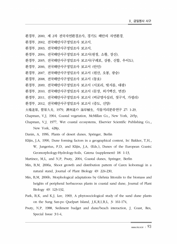 Ⅱ. 금일명사 사구 www.nie.re.kr ? 93 환경부. 2000. 제 2차 전국자연환경조사, 경기도 해안의 자연환경. 환경부. 2002. 전국해안사구정밀조사 보고서. 환경부. 2003. 전국해안사구정밀조사 보고서. 환경부. 2004. 전국해안사구정밀조사 보고서 원청, 소황, 장신 환경부. 2005. 전국해안사구정밀조사 보고서 구례포, 삼봉, 신합, 우이도 환경부. 2006. 전국해안사구정밀조사 보고서 안인 환경부. 2007. 전국해안사구정밀조사 보고서 원산, 오봉, 광승 환경부. 2008. 전국해안사구정밀조사 보고서 동호 환경부. 2009. 전국해안사구정밀조사 보고서 서포리, 밧지름, 대광 환경부. 2010. 전국해안사구정밀조사 보고서 둔장, 외기백산, 면전 환경부. 2011. 전국해안사구정밀조사 보...