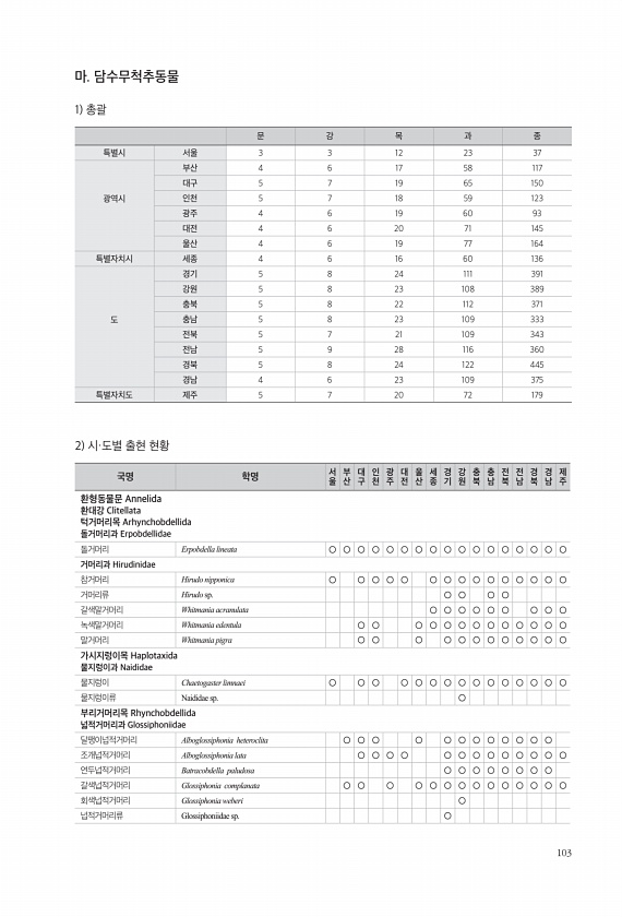 103 마. 담수무척추동물 1 총괄 문 강 목 과 종 특별시 서울 3 3 12 23 37 광역시 부산 4 6 17 58 117 대구 5 7 19 65 150 인천 5 7 18 59 123 광주 4 6 19 60 93 대전 4 6 20 71 145 울산 4 6 19 77 164 특별자치시 세종 4 6 16 60 136 도 경기 5 8 24 111 391 강원 5 8 23 108 389 충북 5 8 22 112 371 충남 5 8 23 109 333 전북 5 7 21 109 343 전남 5 9 28 116 360 경북 5 8 24 122 445 경남 4 6 23 109 375 특별자치도 제주 5 7 20 72 179 2 시·도별 출현 현황 국명 학명 서 울 부산 대구 인천 광주 대전 울산 세종 경기 강원 충북 ...