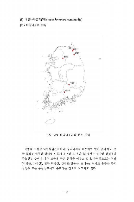 91 배암나무군락 가 배암나무의 개황 그림 배암나무군락 분포 지역 북방계 고산성 낙엽활엽관목이다 우리나라를 비롯하여 일본 홋카이도 중 국 동북부 백두산 일대에 드물게 분포한다 우리나라에서는 설악산 산정부와 주능선부 주변에 아주 드물게 작은 군락을 이루고 있다 문헌상으로는 경남 지리산 가야산 전북 덕유산 강원도 점봉산 오대산 경기도 용문산 등의 산정부 또는 주능선부에도 분포하는 것으로 보고되고있다