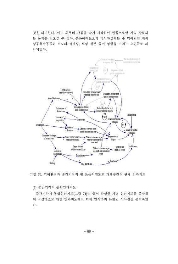 88 것을 의미한다. 이는 외부의 간섭을 받기 시작하면 한쪽으로만 계속 강화되 는 문제를 일으킬 수 있다. 붉은어깨도요의 먹이환경에는 주 먹이원인 저서 성무척추동물의 밀도와 생체량, 토양 성분 등이 영향을 미치는 요인들로 파 악되었다. 그림 70. 먹이환경과 중간기착지 내 붉은어깨도요 개체수간의 관계 인과지도 4 중간기착지 통합인과지도 중간기착지 통합인과지도 그림 71 는 앞서 작성한 개별 인과지도를 종합하 여 작성하였고 개별 인과지도에서 미처 인식하지 못했던 시사점을 분석하였다.