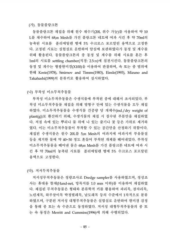 85 가 동물플랑크톤 동물플랑크톤 채집을 위해 원수 채수기 20L 취수 가능 를 사용하여 약 10 L를 채수하여 68㎛ Mesh를 가진 플랑크톤 네트에 여과 시킨 후 약 70ml의 농축된 시료를 폴리에틸렌 병에 5% 수크로스 포르말린 용액으로 고정한 다. 고정된 시료는 실험실로 운반하여 암실에 보관하였다가 동정 및 계수를 위해 활용된다. 동물플랑크톤의 종 동정 및 계수를 위해 시료를 흔든 후 1ml의 시료를 settling chamber 직경2.5㎝ 에 침전시킨다. 동물플랑크톤의 동정 및 계수는 형광현미경 X100 을 이용하여 관찰하며, 속 또는 종 범위에 한해 Koste 1978 , Smirnov and Timms 1983 , Einsle 1993 , Mizuno and Takahashi 1999 의 분류...