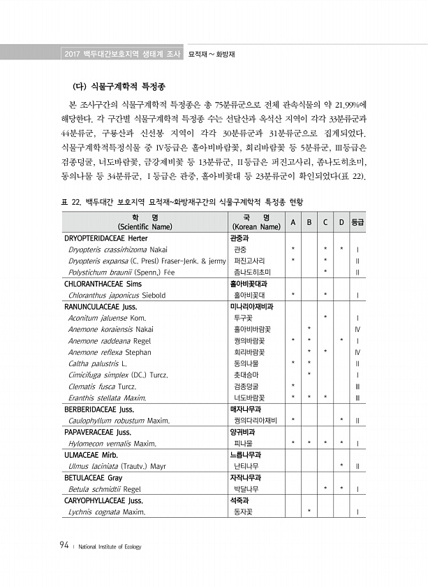 2017 백두대간보호지역 생태계 조사 묘적재 화방재 94 ? National Institute of Ecology 다 식물구계학적 특정종 본 조사구간의 식물구계학적 특정종은 총 75분류군으로 전체 관속식물의 약 21.99%에 해당한다. 각 구간별 식물구계학적 특정종 수는 선달산과 옥석산 지역이 각각 33분류군과 44분류군, 구룡산과 신선봉 지역이 각각 30분류군과 31분류군으로 집계되었다. 식물구계학적특정식물 중 Ⅳ등급은 홀아비바람꽃, 회리바람꽃 등 5분류군, Ⅲ등급은 검종덩굴, 너도바람꽃, 금강제비꽃 등 13분류군, Ⅱ등급은 퍼진고사리, 좀나도히초미, 동의나물 등 34분류군, Ⅰ등급은 관중, 홀아비꽃대 등 23분류군이 확인되었다 표 22 표 22. 백두대간 보호지역 묘적재화방재구간의 식물구계학적 특정종 현...