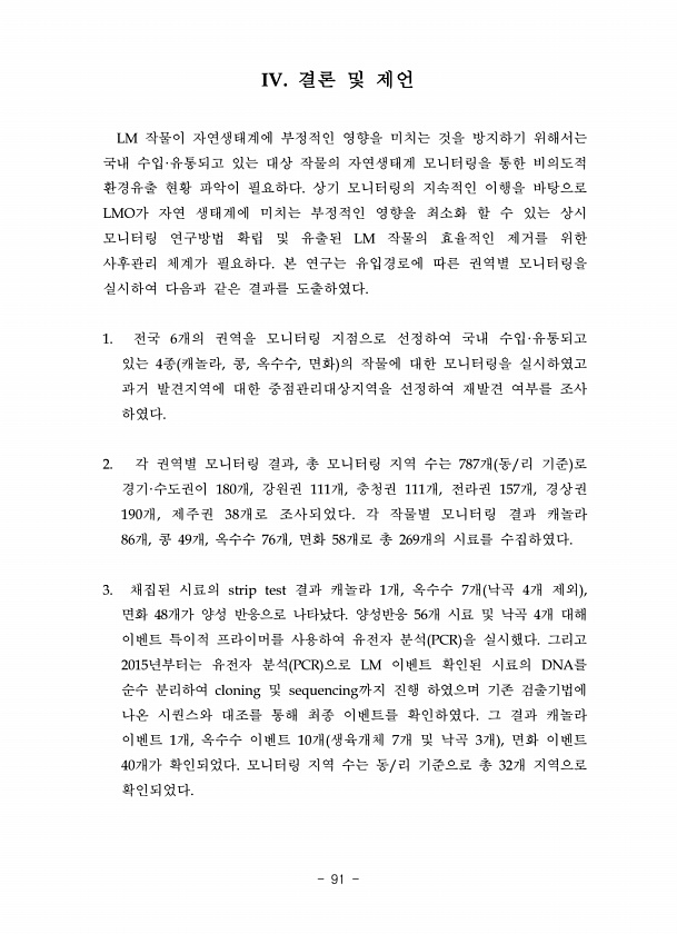IV. 결론 및 제언 LM 작물이 자연생태계에 부정적인 영향을 미치는 것을 방지하기 위해서는 국내 수입·유통되고 있는 대상 작물의 자연생태계 모니터링을 통한 비의도적 환경유출 현황 파악이 필요하다. 상기 모니터링의 지속적인 이행을 바탕으로 LMO가 자연 생태계에 미치는 부정적인 영향을 최소화 할 수 있는 상시 모니터링 연구방법 확립 및 유출된 LM 작물의 효율적인 제거를 위한 사후관리 체계가 필요하다. 본 연구는 유입경로에 따른 권역별 모니터링을 실시하여 다음과 같은 결과를 도출하였다. 1. 전국 6개의 권역을 모니터링 지점으로 선정하여 국내 수입·유통되고 있는 4종 캐놀라, 콩, 옥수수, 면화 의 작물에 대한 모니터링을 실시하였고 과거 발견지역에 대한 중점관리대상지역을 선정하여 재발견 여부를 조사 하였다....