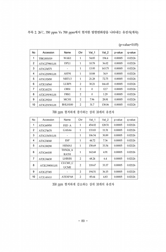 89 부록 2. 26℃, 350 ppm Vs 700 ppm에서 현저한 발현변화량을 나타내는 유전자 계속 p-value 0.05 No Accession Name Chr Val_1 Val_2 p-value q-value 1 TBIG001019 WAK1 1 54.85 194.4 0.00005 0.02126 2 AT1G27980.L01 DPL1 1 10.78 36.02 0.00005 0.02126 3 AT1G54575 1 13.95 163.75 0.00005 0.02126 4 AT1G23090.L01 AST91 1 10.88 34.9 0.00005 0.02126 5 AT1G32450 NRT1.5 1 21.28 72.75 0.00005 0.02126 6 AT2G14560 LURP1 2 30.21 166.45 0.00...