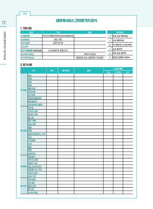 시민참여 생태계서비스 평가 매뉴얼 12 PART 2. 시민참여평가 방법 서식 생태계서비스 간이평가지 양식 2. 평가사항 구분 예시 평가등급 설명 규모별 혜택 지점 지자체 국가 ① 공급 담수 식량 연료 섬유 유전자원 천연약재 장식재료 진흙,미네랄,골재 폐기물처리 친환경에너지발전 ② 조절 대기질 지역적 기후 세계적 기후 물 순환 홍수 재해 폭풍 재해 해충 질병 질병에 영향주는 가축 침식 수질정화 수분 염분 화재 소음차단 ③ 문화 문화유산 여가 및 관광 심미적 가치 정신·종교적가치 영감을 주는 가치 사회적 관계 교육, 연구 ④ 지지 토양 형성 1차 생산 영양 순환 물 순환 서식처 제공 1. 기본사항 항목 기준 설명 ① 일련번호 NO.지자체명-001 ※ 001부터번호부여 ② GPS좌표 경도, 위도 ③ 조사날짜 20...