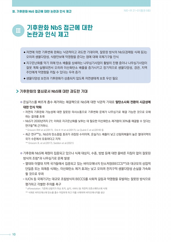 10 NIE-IR 21-01 통권 9호 기후완화 NbS 접근에 대한 논란과 인식 제고 기후완화의 열쇠로서 NbS에 대한 과도한 기대 온실가스를 빠르게 흡수·제거하는 해결책으로 NbS에 대한 낙관적 기대로 탈탄소사회 전환의 시급성에 대한 인식 약화 자연의 기후완화 가능성에 대한 잘못된 의사소통으로 기후변화 문제가 나무심기로 해결 가능한 것으로 오해 하는 결과를 초래 NbS가 2030년까지 2℃ 이하로 지구온난화를 낮추는 데 필요한 이산화탄소 제거량의 30%를 해결할 수 있다는 연구들*에 근거하나, * Griscom BW et al. 2017 , Erb K-H et al. 2017 , Le Qu?r? C et al. 2018 등 최근 연구**는, NbS의 탄소중립 효과가 과장된 수치이며, 온실가스 배출이 낮고 ...
