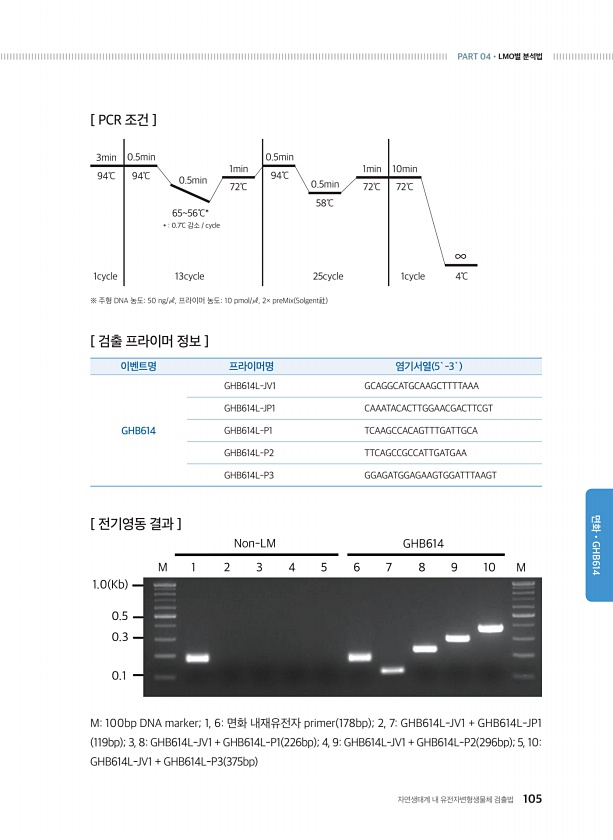 자연생태계 내 유전자변형생물체 검출법 105 PART 04?LMO별 분석법 면화?GHB614 [ 검출 프라이머 정보 ] 이벤트명 프라이머명 염기서열 5`-3` GHB614 GHB614L-JV1 GCAGGCATGCAAGCTTTTAAA GHB614L-JP1 CAAATACACTTGGAACGACTTCGT GHB614L-P1 TCAAGCCACAGTTTGATTGCA GHB614L-P2 TTCAGCCGCCATTGATGAA GHB614L-P3 GGAGATGGAGAAGTGGATTTAAGT M100bp DNA marker; 1, 6면화 내재유전자 primer 178bp ; 2, 7GHB614L-JV1 + GHB614L-JP1 119bp ; 3, 8GHB614L-JV1 + GHB614L-P1 226bp ; 4, 9GHB614L...