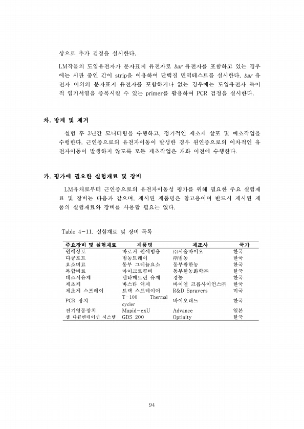 94 상으로 추가 검정을 실시한다. LM작물의 도입유전자가 분자표지 유전자로 bar 유전자를 포함하고 있는 경우 에는 시판 중인 간이 strip을 이용하여 단백질 면역테스트를 실시한다. bar 유 전자 이외의 분자표지 유전자를 포함하거나 없는 경우에는 도입유전자 특이 적 염기서열을 증폭시킬 수 있는 primer를 활용하여 PCR 검정을 실시한다. 차. 방제 및 제거 실험 후 3년간 모니터링을 수행하고, 정기적인 제초제 살포 및 예초작업을 수행한다. 근연종으로의 유전자이동이 발생한 경우 원연종으로의 이차적인 유 전자이동이 발생하지 않도록 모든 제초작업은 개화 이전에 수행한다. 카. 평가에 필요한 실험재료 및 장비 LM유채로부터 근연종으로의 유전자이동성 평가를 위해 필요한 주요 실험재 료 및 장비는 다음과 같으...
