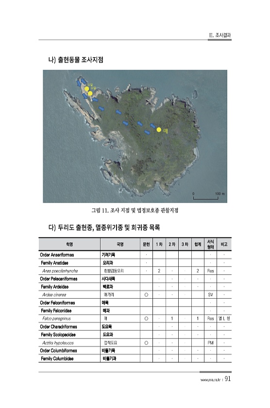 II. 조사결과 www.nie.re.kr ? 91 그림 11. 조사 지점 및 법정보호종 관찰지점 , 학명 국명 문헌 1 차 2 차 3 차 합계 서식 형태 비고 Order Anseriformes 기러기목 Family Anatidae 오리과 Anas poecilorhyncha 흰뺨검둥오리 2 2 Res Order Pelecaniformes 사다새목 Family Ardeidae 백로과 Ardea cinerea 왜가리 ○ SV Order Falconiformes 매목 Family Falconidae 매과 Falco peregrinus 매 ○ 1 1 Res 멸 I, 천 Order Charadriformes 도요목 Family Scolopacidae 도요과 Actitis hypoleucos...
