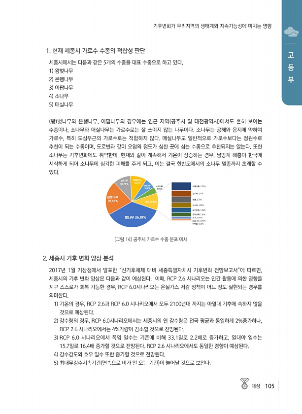 대상 105 고 등 부 기후변화가 우리지역의 생태계와 지속가능성에 미치는 영향 1. 현재 세종시 가로수 수종의 적합성 판단 세종시에서는 다음과 같은 5개의 수종을 대표 수종으로 하고 있다. 1 왕벚나무 2 은행나무 3 이팝나무 4 소나무 5 매실나무 왕 벚나무와 은행나무, 이팝나무의 경우에는 인근 지역 공주시 및 대전광역시 에서도 흔히 보이는 수종이나, 소나무와 매실나무는 가로수로는 잘 쓰이지 않는 나무이다. 소나무는 공해와 음지에 약하여 가로수, 특히 도심부근의 가로수로는 적합하지 않다. 매실나무도 일반적으로 가로수보다는 정원수로 추천이 되는 수종이며, 도로변과 같이 오염의 정도가 심한 곳에 심는 수종으로 추천되지는 않는다. 또한 소나무는 기후변화에도 취약한데, 현재와 같이 계속해서 기온이 상승하는 경우,...