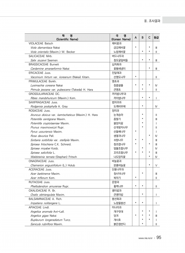 Ⅱ. 조사결과 www.nie.re.kr ? 95 학 명 Scientific Name 국 명 Korean Name A B C 등급 VIOLACEAE Batsch 제비꽃과 Viola diamantiaca Nakai 금강제비꽃 * * Ⅲ Viola orientalis Maxim. W. Becker 노랑제비꽃 * * Ⅱ SALICACEAE Mirb. 버드나무과 Salix siuzevii Seemen 참오굴잎버들 * * Ⅲ BRASSICACEAE Burnett 십자화과 Cardamine amaraeformis Nakai 꽃황새냉이 * Ⅲ ERICACEAE Juss. 진달래과 Vaccinium hirtum var. koreanum Nakai Kitam. 산앵도나무 * Ⅱ PRIMULACEAE Borkh. 앵초과 Lys...
