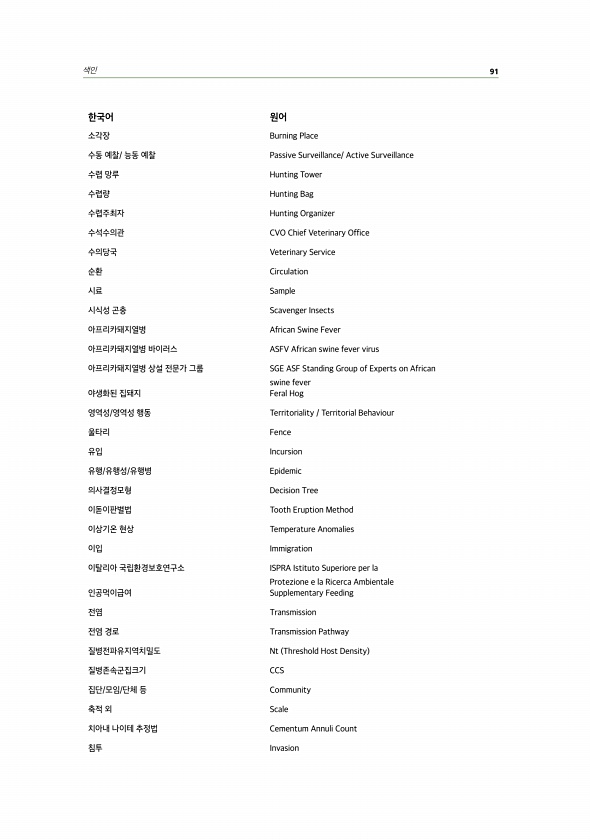 색인 91 한국어 원어 소각장 Burning Place 수동 예찰/ 능동 예찰 Passive Surveillance/ Active Surveillance 수렵 망루 Hunting Tower 수렵량 Hunting Bag 수렵주최자 Hunting Organizer 수석수의관 CVO Chief Veterinary Office 수의당국 Veterinary Service 순환 Circulation 시료 Sample 시식성 곤충 Scavenger Insects 아프리카돼지열병 African Swine Fever 아프리카돼지열병 바이러스 ASFV African swine fever virus 아프리카돼지열병 상설 전문가 그룹 SGE ASF Standing Group of Experts on African swine fe...