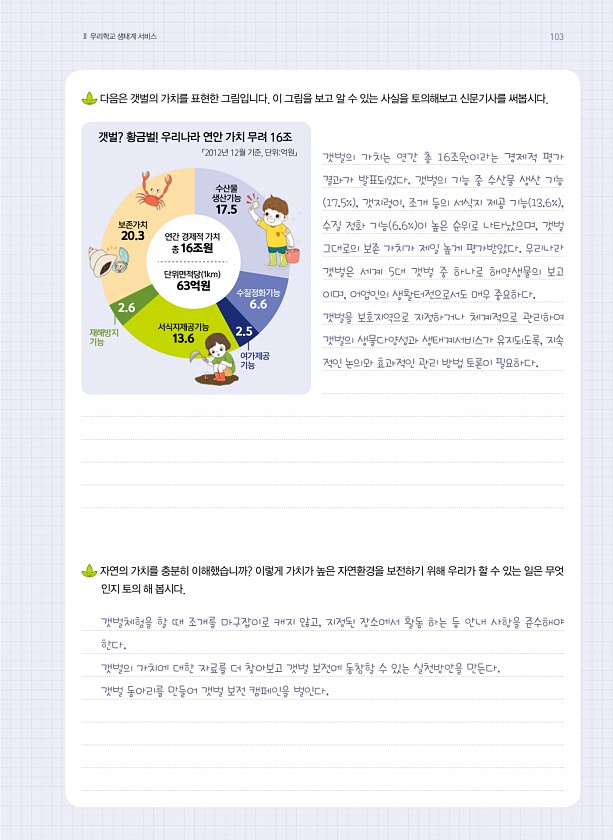 갯벌의 가치는 연간 총 16조원이라는 경제적 평가 결과가 발표되었다. 갯벌의 기능 중 수산물 생산 기능 17.5% , 갯지렁이, 조개 등의 서식지 제공 기능 13.6% , 수질 정화 기능 6.6% 이 높은 순위로 나타났으며, 갯벌 그대로의 보존 가치가 제일 높게 평가받았다. 우리나라 갯벌은 세계 5대 갯벌 중 하나로 해양생물의 보고 이며, 어업인의 생활터전으로서도 매우 중요하다. 갯벌을 보호지역으로 지정하거나 체계적으로 관리하여 갯벌의 생물다양성과 생태계서비스가 유지되도록, 지속 적인 논의와 효과적인 관리 방법 토론이 필요하다. 다음은 갯벌의 가치를 표현한 그림입니다. 이 그림을 보고 알 수 있는 사실을 토의해보고 신문기사를 써봅시다. 자연의 가치를 충분히 이해했습니까? 이렇게 가치가 높은 자연환경을 보전하...