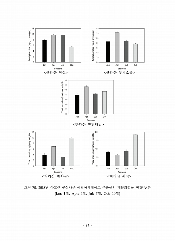 87 한라산 영실 한라산 윗세오름 한라산 진달래밭 지리산 반야봉 지리산 세석 그림 70. 2018년 아고산 구상나무 에틸아세테이트 추출물의 페놀화합물 함량 변화 Jan1월, Apr4월, Jul7월, Oct10월