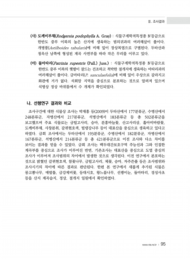 Ⅱ. 조사결과 www.nie.re.kr ? 95 사 도깨비부채 Rodgersia podophylla A. Gray 식물구계학적특정종 Ⅳ등급으로 한반도 중부 이북의 높은 산지에 생육하는 범의귀과의 여러해살이 풀이다. 개병풍[Astilboides tabularis]에 비해 잎이 장상복엽으로 구별된다. 두타산과 청옥산 남쪽에 형성된 계곡 사면부를 따라 작은 무리를 이루고 있다. 아 돌마타리 Patrinia rupestris Pall. Juss. 식물구계학적특정종 Ⅳ등급으로 한반도 중부 이북의 햇볕이 잘드는 건조하고 척박한 절개지에 생육하는 마타리과의 여러해살이 풀이다. 금마타리 P. sanculaefolia 에 비해 잎이 우상으로 갈라지고 화관에 거가 없다. 석회암 지역을 중심으로 분포하는 것으로 알려져 있으며 ...