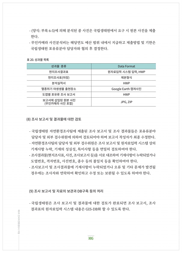 양식부록 ?-? 에?의해?분석된?종?사진은?국립생태원에서?요구?시?원본?사진을?제출 한다. 무인카메라?사진분석비는?해당연도?예산?범위?내에서?지급하고?제출방법?및?기한은 국립생태원?포유류분야?담당자와?협의?후?결정한다. 8 조사?보고서?및?결과물에?대한?검토 국립생태원?자연환경조사팀에?제출된?조사?보고서?및?조사?결과물들은?포유류분야 담당자?및?외부?검수위원에?의하여?검토되어야?하며?보고서?작성자가?최종?수정한다. 자연환경조사팀의?담당자?및?외부?검수위원은?조사?보고서?및?원자료입력?시스템?상의 기재사항?누락, 기재의?성실성, 특이사항?등을?면밀히?검토하여야?한다. 조사결과물 현지조사표, 사진, 조사보고서?등 을?서로?대조하여?기재사항이?누락되었거나 도엽번호, 격자번호, 사진번호, 종수?등의?불일치?등을?확...
