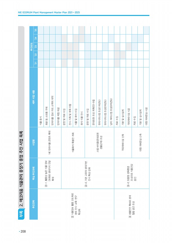 부록 2. 에코리움 식물관리 중장기 중점 추진 사업 목록 추진전략 핵심 추진과제 사업명 세부 사업 내용 추진년도 ‘21 ‘22 ‘23 ‘24 ‘25 ? 식물정보 활용 고도화로 생태 전시·교육·연구 특성화 ?-1. 활용성 높은 식물 정보 DB화로 생태가치 전달 확대 NIE 반려식물 콘텐츠 확대 식물 증식 화분 등 소모품 구매 반려식물 정보 카드 소책자 제작 반려식물 체험 제공 ?-2. 기관 고유의 생태기반 전시 특성 강화 식물화석 특별전 개최 문헌 및 자료 수집 전시 기획 및 계획 수립 식물 및 화석 수집 화석 식물 전시 스텝 바이옴 온대초원 생물군계 조성 문헌 및 자료 수집 온대초원 조성 계획 안 수립 유라시아스텝 조성 1차년도 유라시아스텝 조성 2차년도 남미·북미스텝 조성 3차년도 ? 생물안전 확보로 생태...
