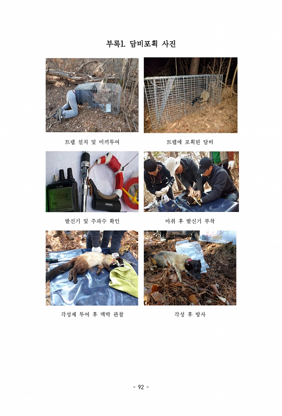 92 부록1. 담비포획 사진 트랩 설치 및 미끼투여 트랩에 포획된 담비 발신기 및 주파수 확인 마취 후 발신기 부착 각성제 투여 후 맥박 관찰 각성 후방사