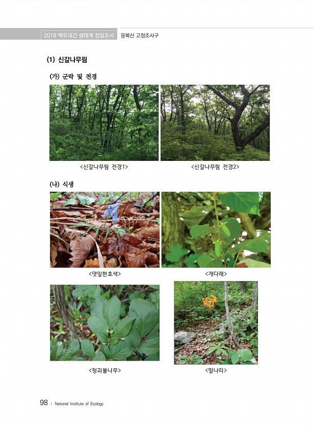 2018 백두대간 생태계 정밀조사 응복산 고정조사구 98 ? National Institute of Ecology 댓잎현호색 개다래 청괴불나무 말나리 1 신갈나무림 가 군락 및 전경 신갈나무림 전경1 신갈나무림 전경2 나식생