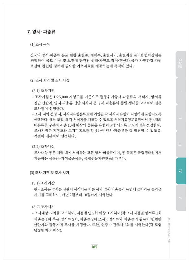 7. 양서·파충류 1 조사?목적 전국의?양서·파충류?분포?현황 출현종, 개체수, 출현시기, 출현지점?등 및?변화상태를 파악하여?국토?이용?및?보전에?관련된?생태·자연도?작성·갱신과?국가?자연환경·자원 보전에?관련된?정책에?필요한?기초자료를?제공하는데?목적이?있다. 2 조사?지역?및?조사?대상 ?.? 조사지역 조사지점은 ???,??? 지형도를?기준으로?멸종위기양서·파충류의?서식지, 양서류 집단?산란지, 양서·파충류?집단?서식지?등?양서·파충류의?종별?생태를?고려하여?전문 조사원이?선정한다. 조사?지역?선정?시, 서식지유형분류표에?기입된?각?서식지?유형이?다양하게?포함되도록 선택한다. 해당?도엽?내?각?서식지를?대표할?수?있도록?서식지유형분류표에서?총 ?개의 대분류를?구분하고?총 ??개?이상의?중분류?유형이?포...